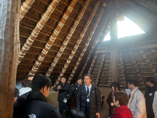 竪穴住居見学では、住居の仕組みについて、参加者から質問がたくさん行われました。